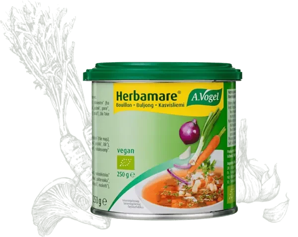 Herbamare Bouillon er en urtebouillon, der kan hjælpe dig med den gode smag i køkkenet. Med Herbamare kan du skrue op for smagen i alt fra varmende vintersupper, simreretter og grundsaucer til vegetarkøkkenet eller de kødfrie dage. Herbamare Bouillon er nemlig fyldt med kraften fra økologisk dyrkede grøntsager og krydderier, hvilket gør den ideel til supper, saucer, sammenkogte retter og i kogevandet til for eksempel ris.