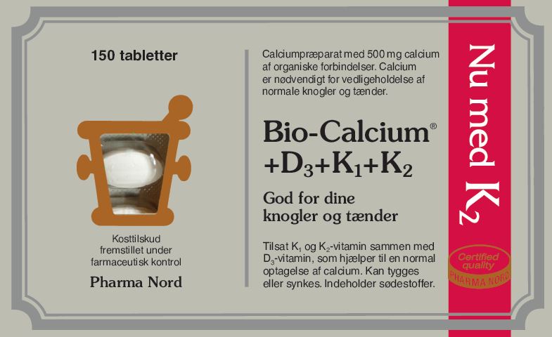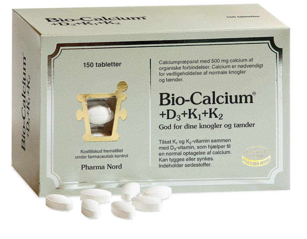Bio-Calcium+D3+K1+K2 er tabletter med de tre aktive næringsstoffer calcium, D-vitamin og K-vitamin, som alle er med til at vedligeholde normale knogler. Calcium ioniseres i mavesækken, hvorefter calcium-ionerne optages i tarmen. D-vitamin bidrager til en normal optagelse af calcium. K-vitamin deltager i knoglernes mineralisering ved at binde calcium i knoglevævet.