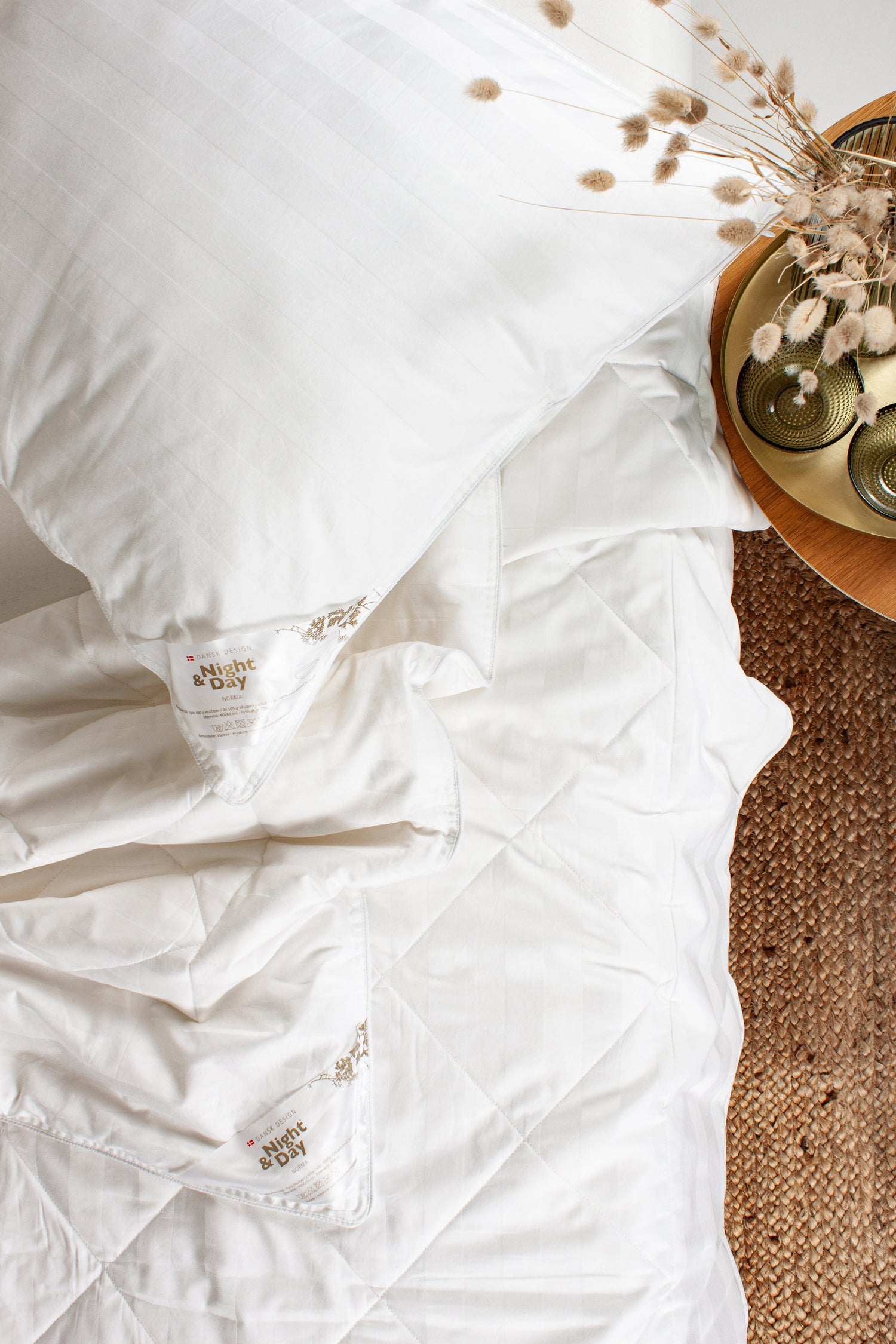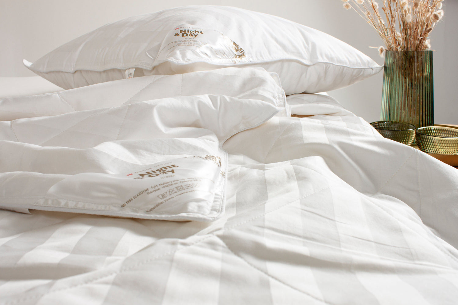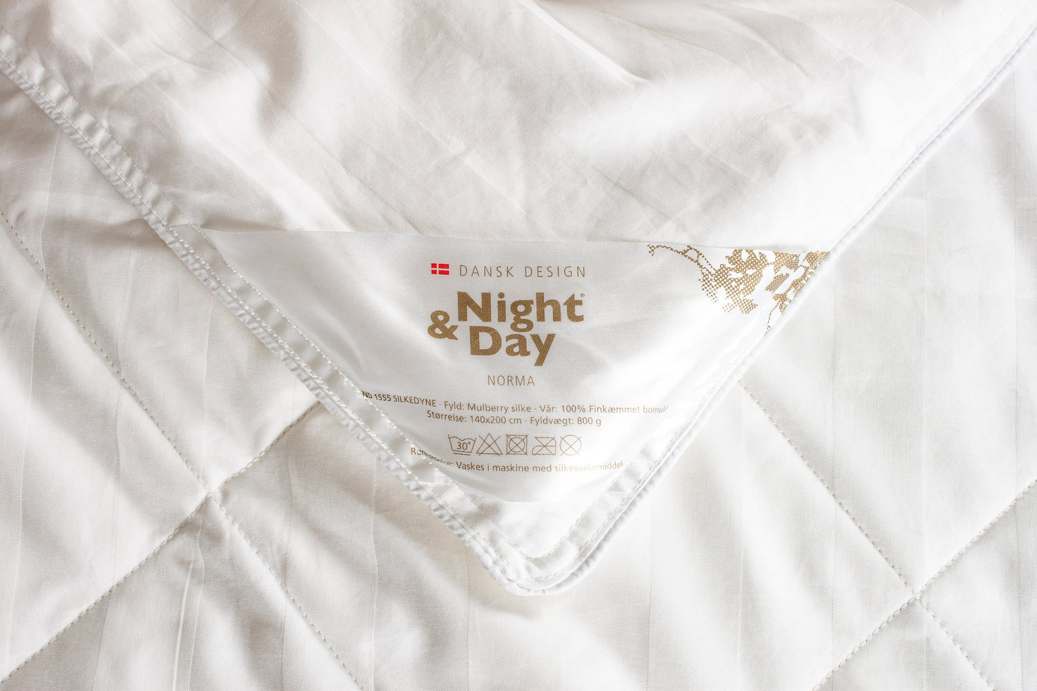 Oplev en behagelig og tempereret nattesøvn med denne eksklusive silkedyne fra NIGHT & DAY i størrelsen 140×200 cm. Dynen er en helårsdyne med fyld af 800 g 100% Mulberry silke – en af de fineste og mest eftertragtede silketyper.
