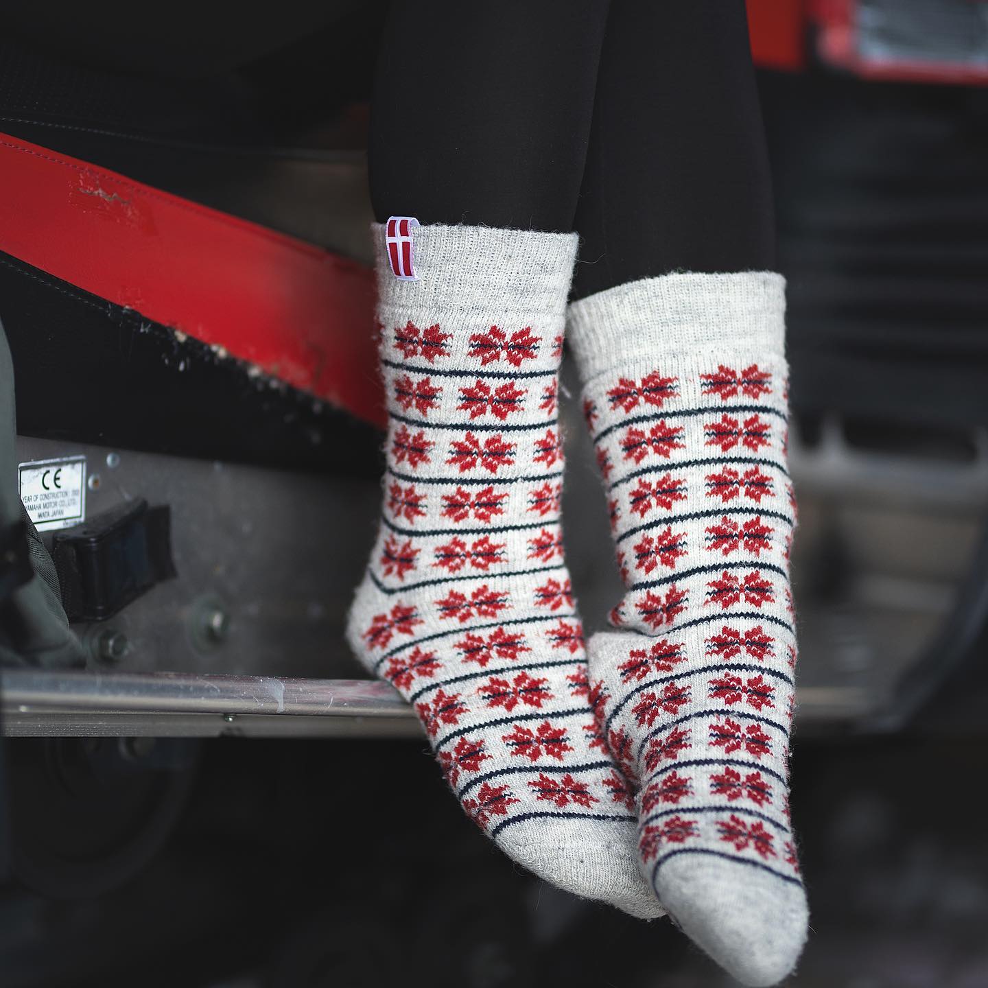 Uldne ragsokker af 80% uld. Ragsokkerne har et lille vævet dansk flag, samt bliver leveret i flot æske af recycl. pap.