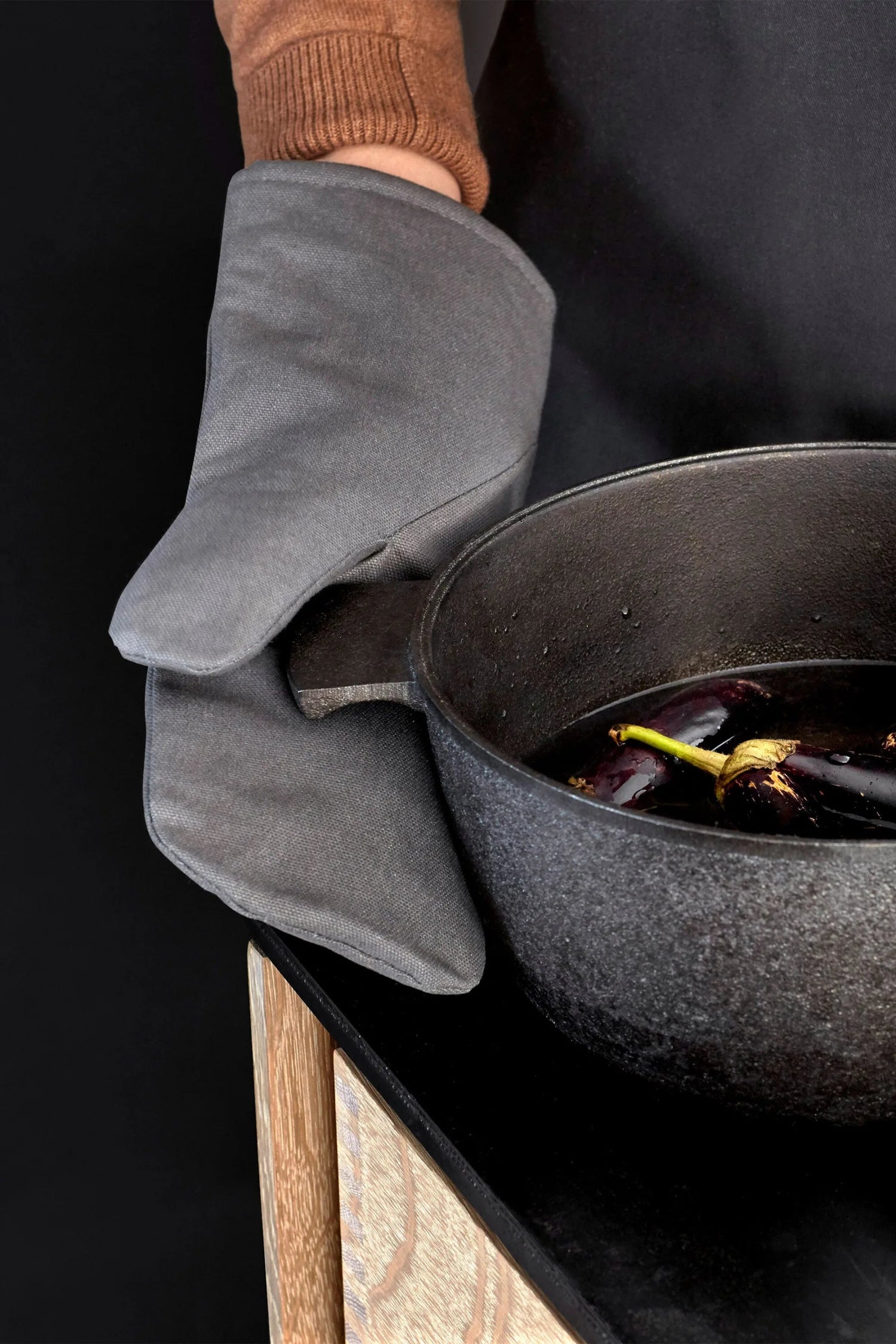 Funktionelle og æstetiske ovnhandsker i 100% økologisk bomuld. Varmebeskyttelsen er så god, at du trygt kan tage ved suppegryden eller løfte brænd varme fade ud af ovnen.