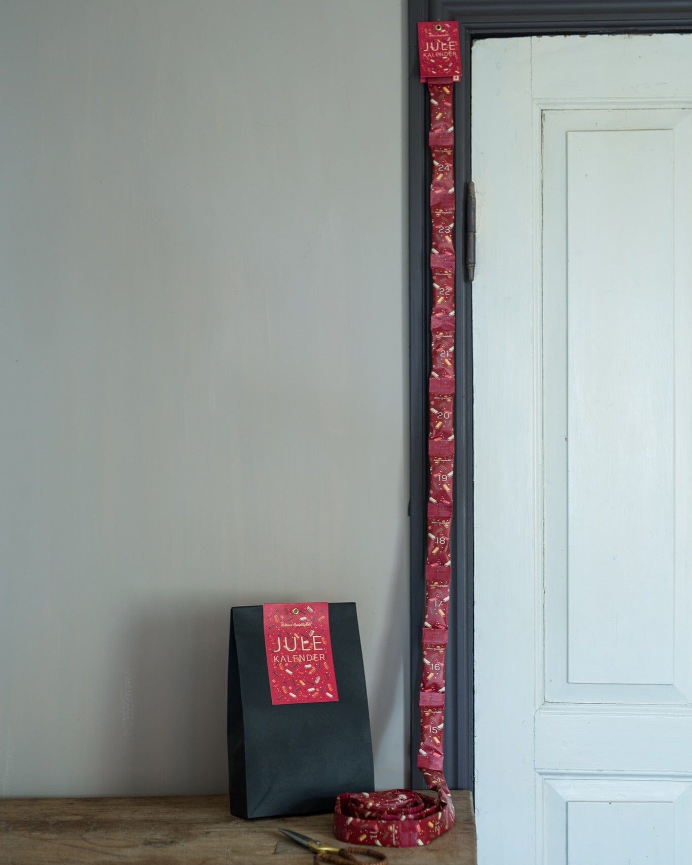 Vores smukke julerøde kalender er 2,5 meter lang og pakket i papir.