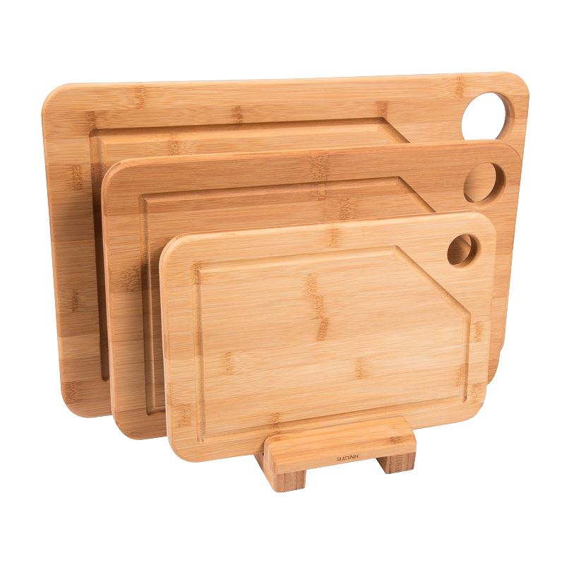 De 3 lækre skærebrætter fra Suztain leveres med en smart holder, der gør det let at tørre skærebrætterne.