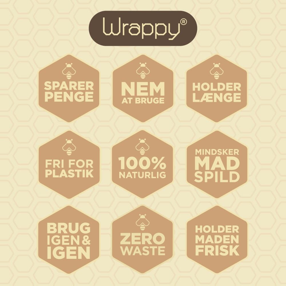 Wrappy er et genanvendeligt og vaskbart madindpakningsark fremstillet her i Danmark af økologisk bomuld med en tynd belægning af bivoks, træharpiks og økologisk vegetabilsk olie. Wrappy madpapir kan genbruges dagligt i ca. 12 måneder, før det skal opfriskes med deres DIY-bar eller smides ud med dit bioaffald.