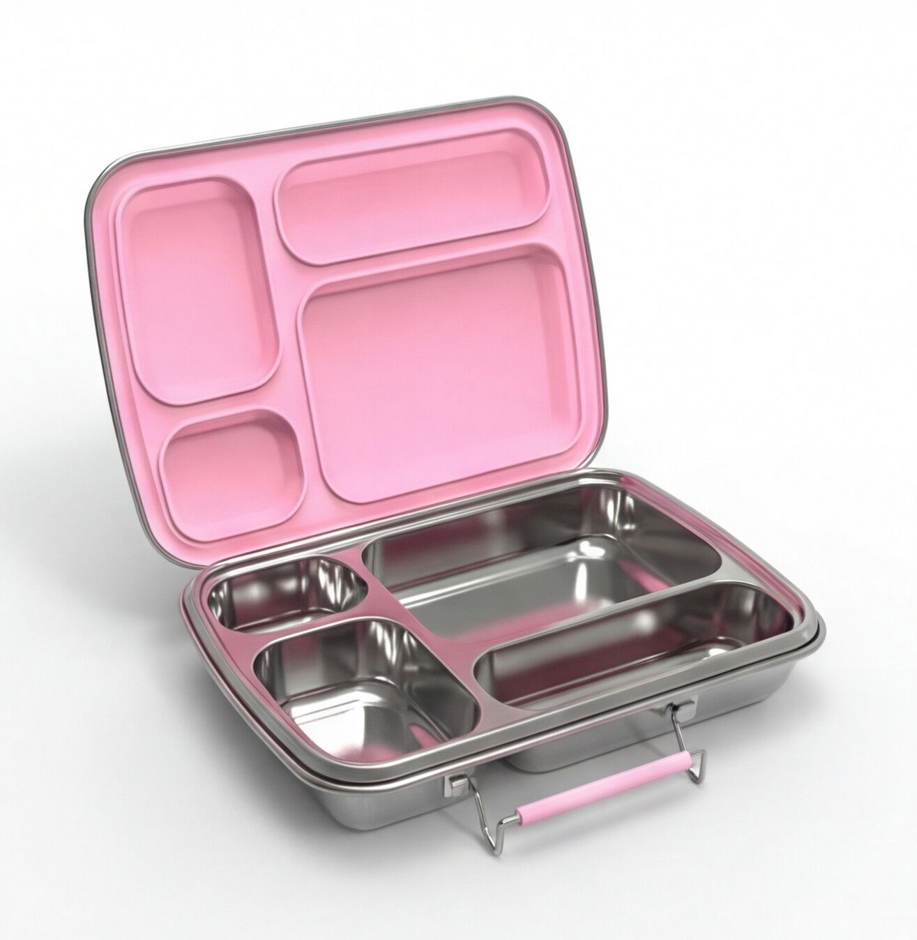 Gør madpakken nem og overskuelig med Suztains madkasse i rustfrit stål med 4 rum – en stilren og funktionel løsning, der gør det let at pakke en varieret frokost uden brug af engangsemballage.