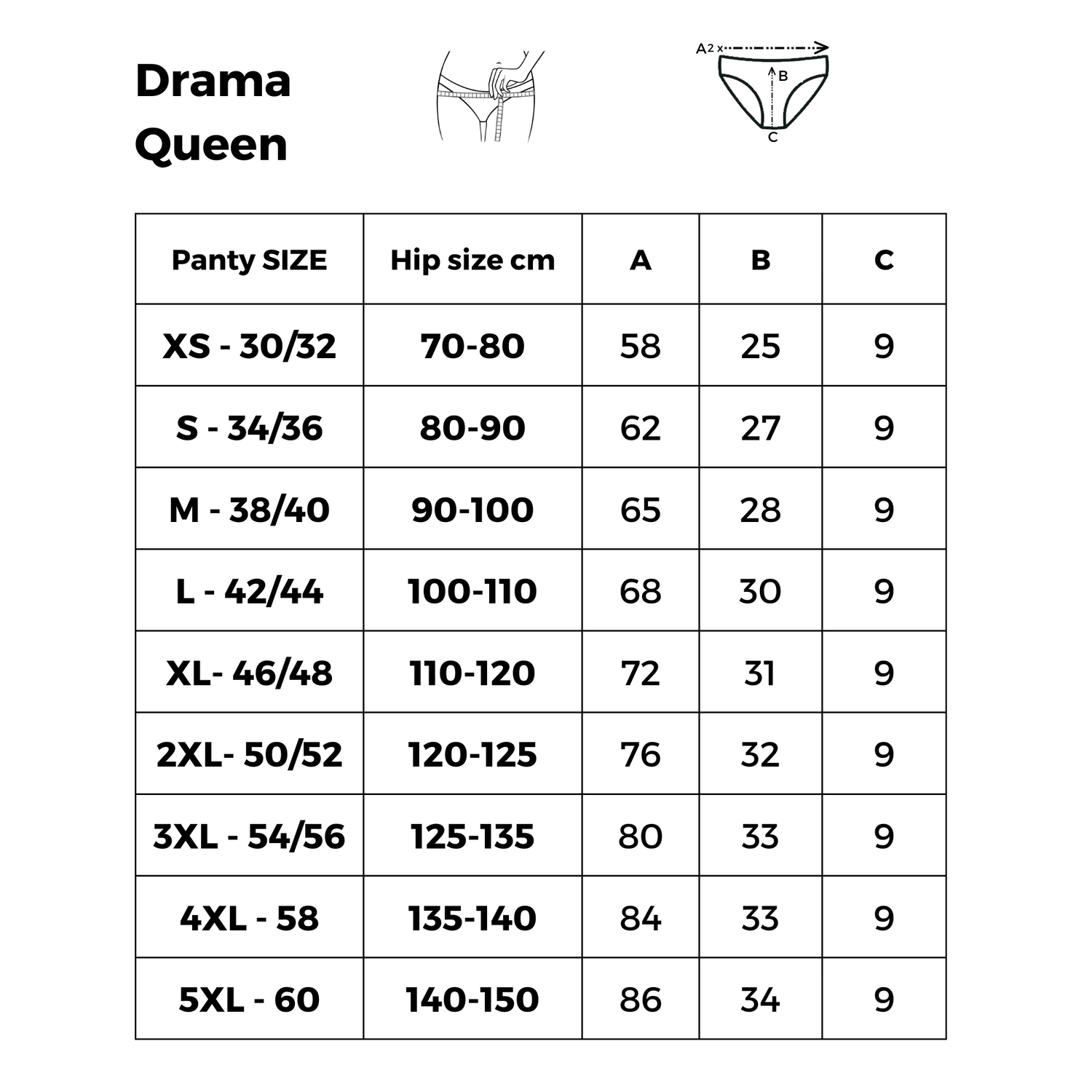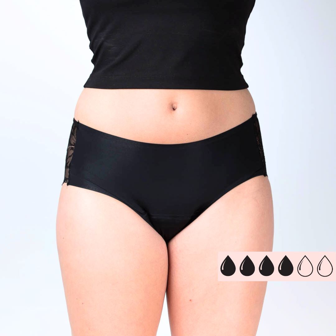 Drama Queen er menstruationstrussen til dig, der virkelig gerne vil føle sig smuk, elegant og sikker på samme tid. Denne absorberende trusse har en dramatisk blondebagside og en klassisk sort front. Det stretchy materiale sidder let og løst på kroppen. Trussens indbyggede beskyttelse er kun placeret i skridtet og er meget absorberende. Den bruges ofte med heavy flow i op til 6 timer og med medium flow i op til 12 timer.