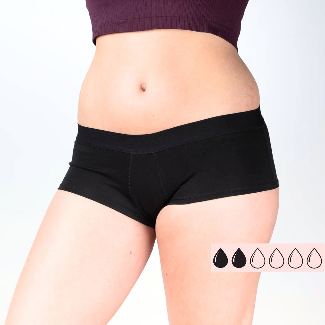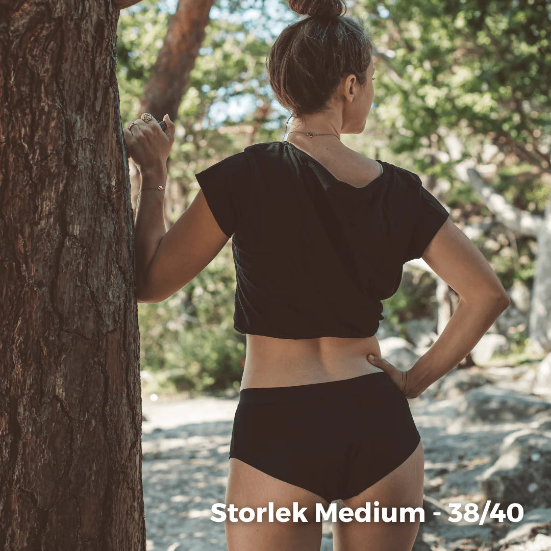 Hippy Yay er en klassisk hipster i økologisk bomuld, med lavt ben- og taljesnit. Tynde kanter gør, at den sidder behageligt under stramt tøj og er den perfekte beskyttelse, mens du venter på din menstruation eller som en back-up til din menstruationskop. Trussen fungerer også fantastisk til udflåd og sved. Anvendes ofte med medium flow i op til 4 timer og med light flow i op til 24 timer.