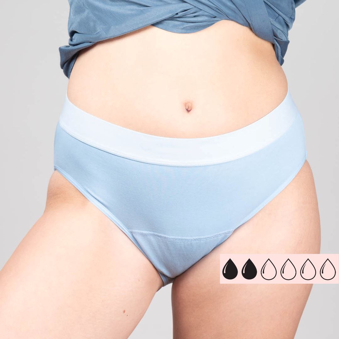 Heavenly er en menstruationstrusse i light flow i en smuk himmelblå farve. Trussen er blå indvendig og udvendig og har en tynd beskyttelse kun i skridtet. Modellen er klassisk med medium talje og rummelige ben åbninger. Trussen bruges ofte ved medium flow i op til 4 timer og ved llight flow i op til 24 timer.