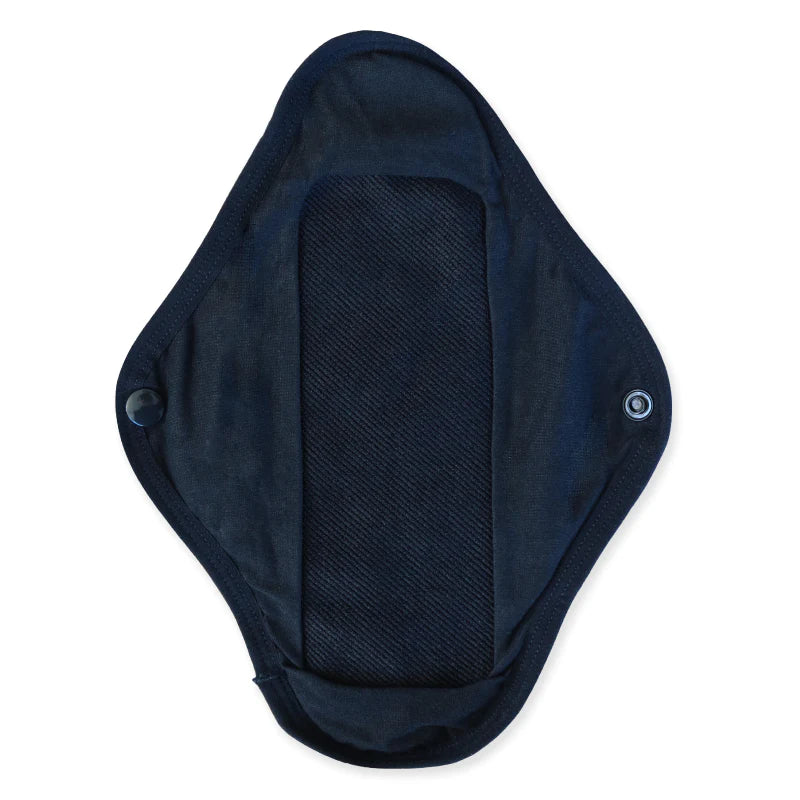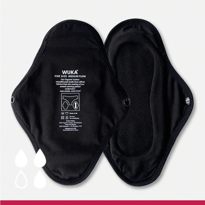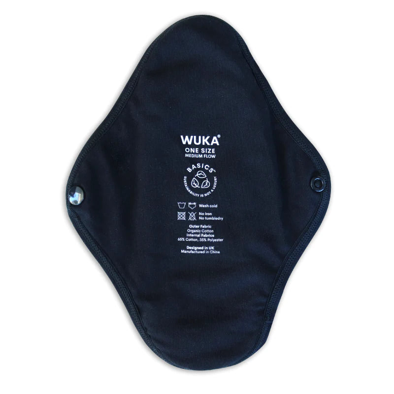 Wukas genanvendelige stofbind i økologisk bomuld er lavet af reststof fra deres prisvindende menstruationsundertøj. En foring med COOLMAX®-teknologi gør dem lækagesikre med ultraabsorberende egenskaber. Disse mellemlange indlæg er superbløde mod huden og perfekte til at absorbere mellemstore strømme. De har vinger med genanvendelige trykknapper, der kan fastgøres i ethvert undertøj. Med kilen altid opad kan indlægget bæres på begge sider - nemt! Læg blot bindet i vaskemaskinen med dit normale vasketøj og lad det lufttørre.