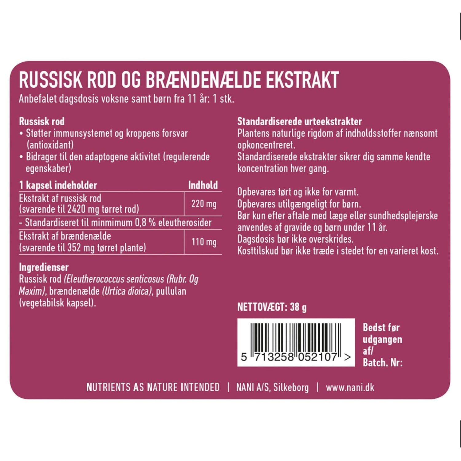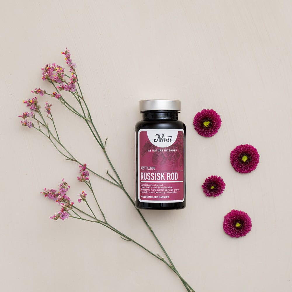 Russisk rod er en adaptogen urt kendt for dens energigivende egenskaber i perioder med udmattelse og træthed, samt bidrager til optimal mental og kognitiv aktivitet. Urten er derfor et oplagt tilskud i mentalt og fysisk udfordrende perioder. Nanis Russisk rod er desuden kombineret med brændenældeekstrakt, der ligeledes støtter kroppens immunsystem og bidrager med egen næringsværdi i form af plantenæringsstoffer.