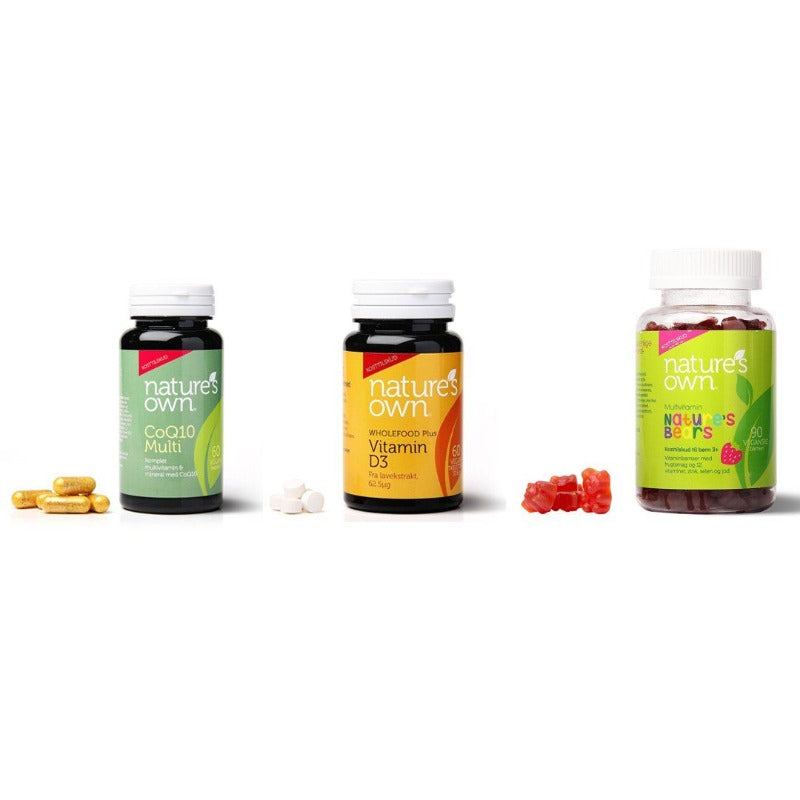Her er både til voksne og børn. Til de voksne Q10 Multivitamin og D3 vitamin. Til børn multivitamin i form af velsmagende bjørne