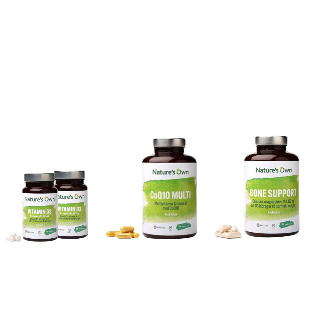 De allervigtigste organiske og tilskud til voksne over 30. D3 vitamin, Q10 Multivitamin og Bone support.