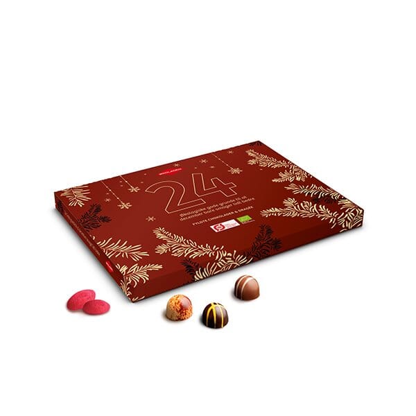 24 økologiske fyldte chokolader og dragéer. Håndlavet af de reneste råvarer fra naturen. Hver af de 12 varianter findes bag 2 låger.