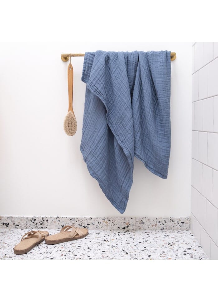 Stort badehåndklæde. Oplev frihed og vægtløshed med kombinationen af 3-lags letvægtsgaze, bløde farvetoner og ukonventionelle håndklædestørrelser til dine hænder, hår og krop. Let, smuk og hurtigtørrende. Et badehåndklæde med en ægte og ren flow følelse.