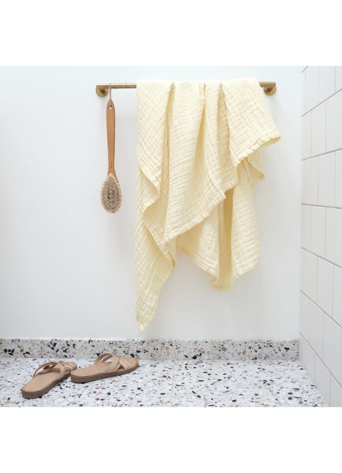 Stort badehåndklæde. Oplev frihed og vægtløshed med kombinationen af 3-lags letvægtsgaze, bløde farvetoner og ukonventionelle håndklædestørrelser til dine hænder, hår og krop. Let, smuk og hurtigtørrende. Et badehåndklæde med en ægte og ren flow følelse.
