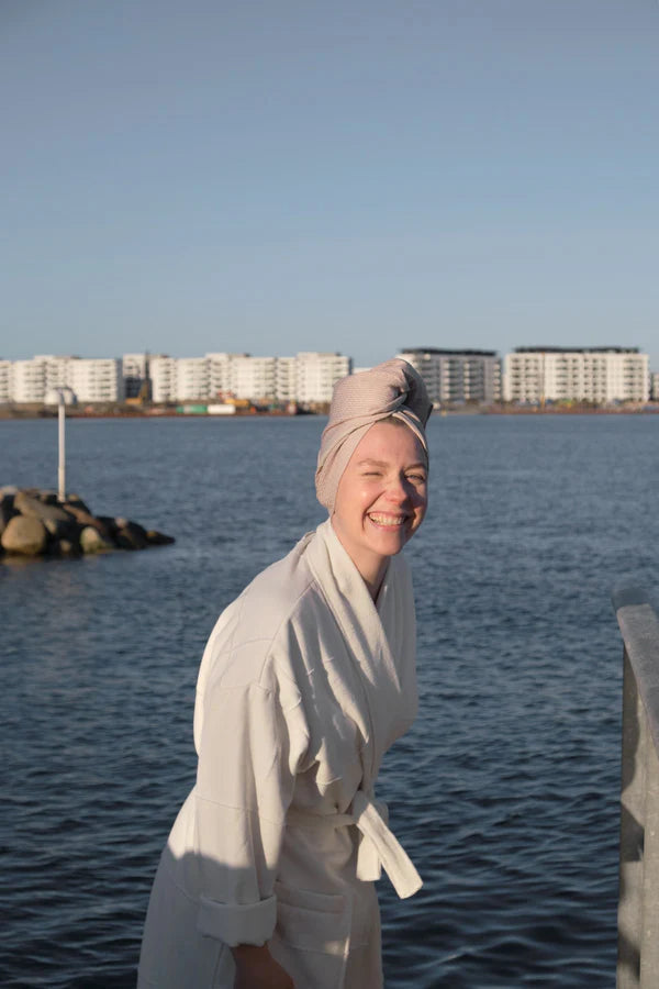 Brug dette håndklæde til håret eller som et ekstra langt håndklæde til dine hænder. Håndklædet har et bånd, som giver et smukt grafisk udtryk og en funktion. Båndet kan også bruges til at holde håndklædet fast rundt om hovedet.