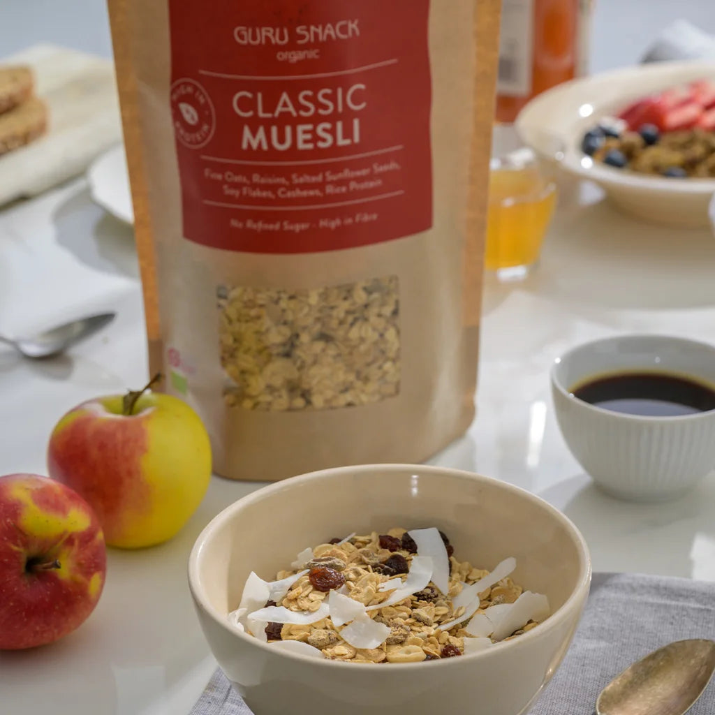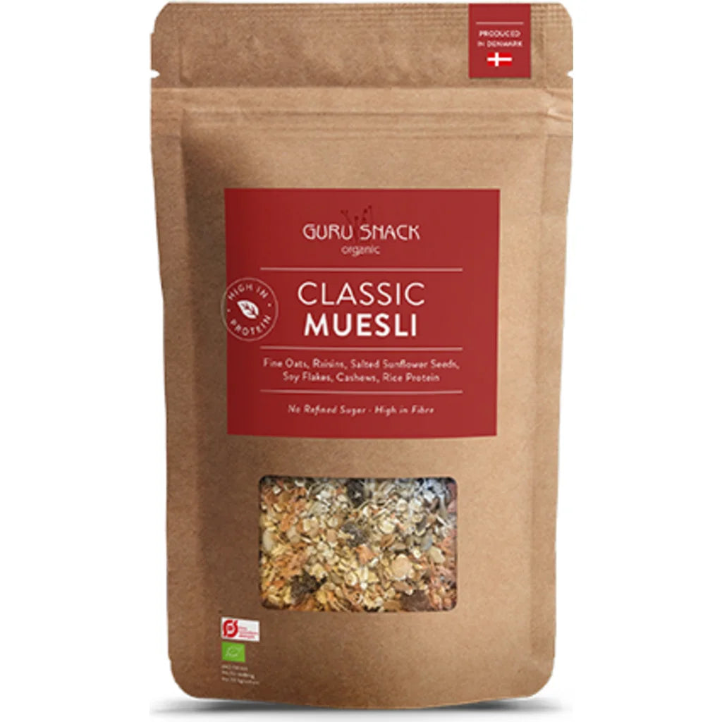 Classic Muesli er en helt speciel proteinfyldt muesli med havre, sojaflager og rosiner, knasende cashewnødder og risprotein - økologisk og håndblandet i Danmark. Giver dig en god start på dagen!