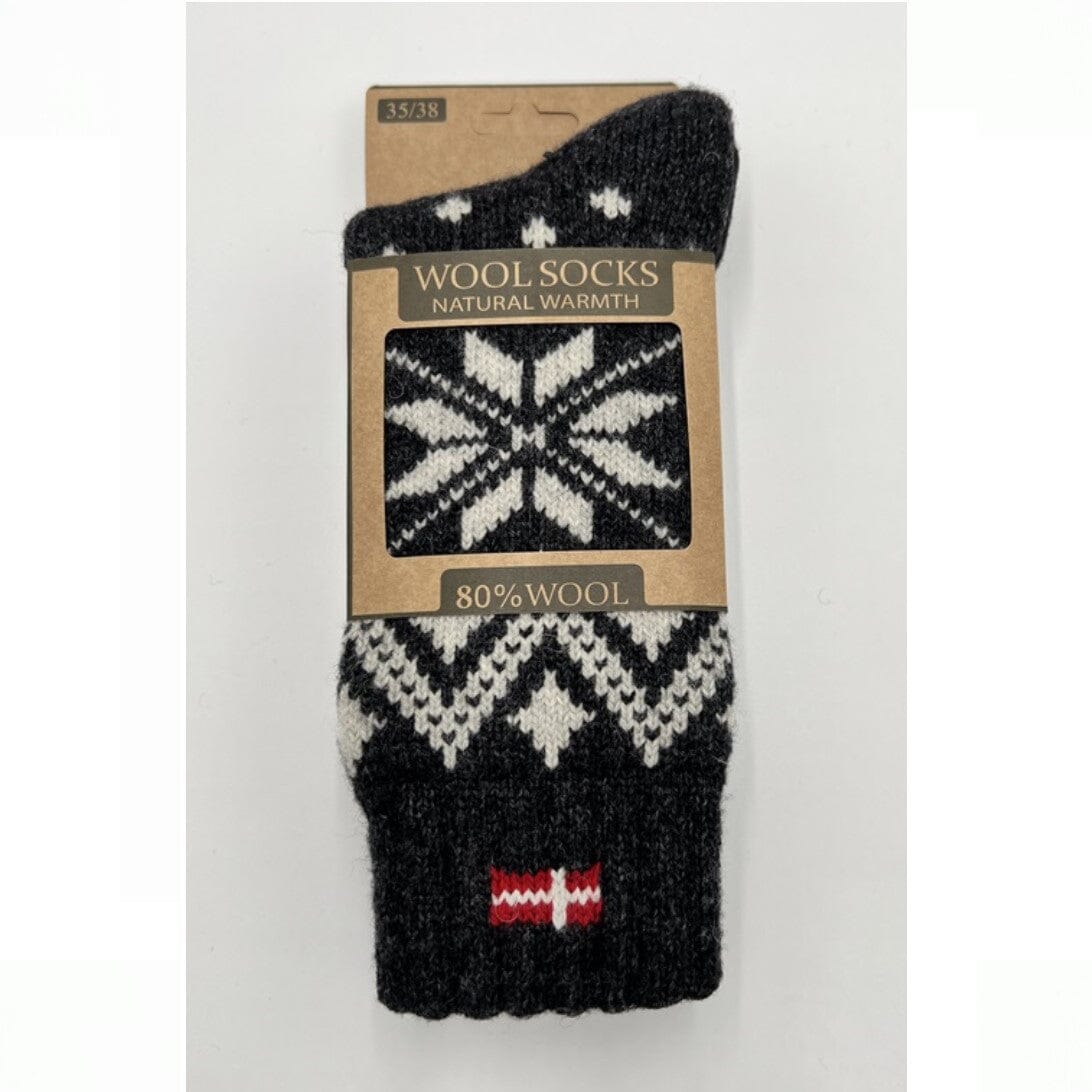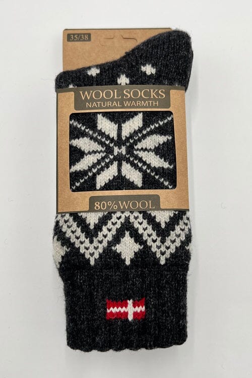 Bløde og kraftige ragsokker af 80% uld med lille strikket dansk flag fra WOOLWEAR of Scandinavia®.