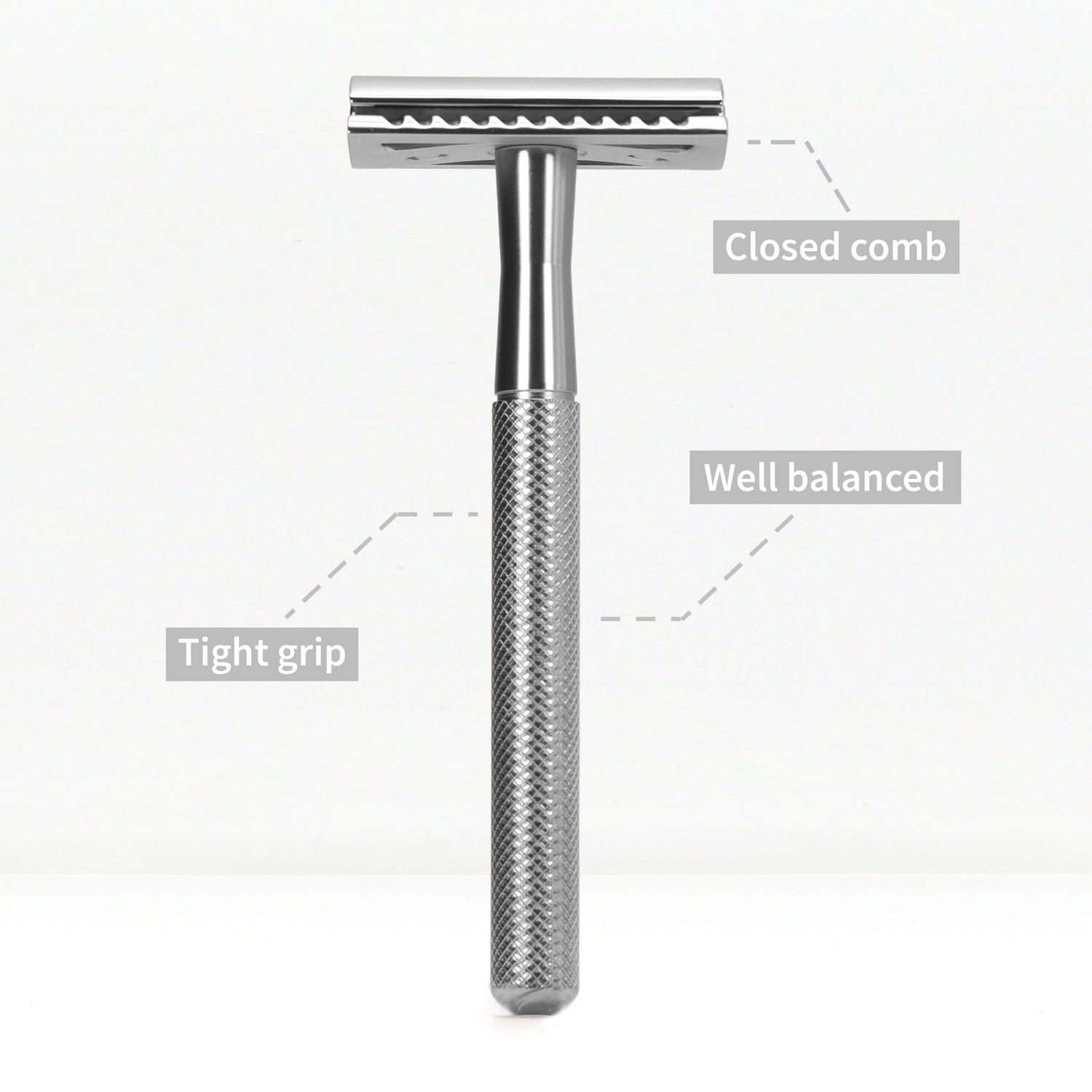 Med en barberskraber i metal minimere du dit plastikaffald, det eneste, der skal udskiftes, er barberbladet der er fremstillet i rustfrit stål. Helt i I modsætning til hovedet på en plastikskraber, kan barberbladet på en safety razor nemt sorteres og genanvendes. Det bliver desuden også billigere på den lange bane med en safty razor i metal. Barberbladene er dobbeltsidede, hvilket gør det muligt at bruge begge sider af barberskraberen.