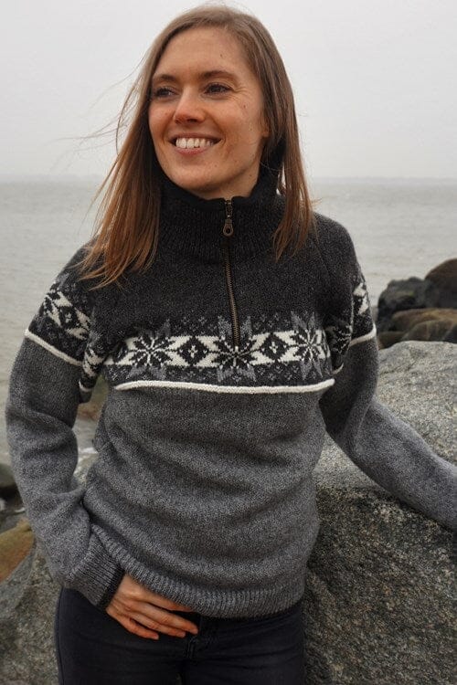 Flot Islandsk sweater strik med et gammelt originalt Islænder mønster. Med flot kontrast mellem den råhvide bundfarve & det mørke mønster. Der er kraftig ribkant ved håndled, hals samt nederst. Modellen er en unisex & det er en virkelig smuk og aldeles retromoderne sweater. OBS: Trøjen er stor i størrelsen, bestil 1 nr. mindre end du normalt ville.