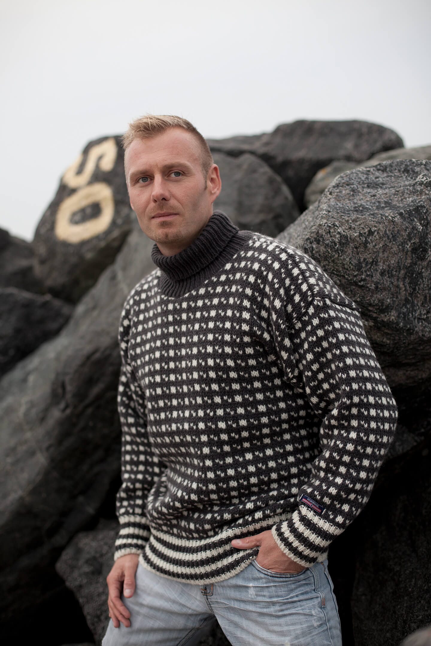 Flot klassisk Islandsk sweater med rullekrave i 100% ren ny uld. DeIslandske sweaters er utrolig moderne og med traditionelt Islandsk strikke mønster. Sweateren er produceret af kraftig 3gage garn i bedste kvalitet. Den har en flot bred stribet ribkant forneden. Og er produceret af Gjestal Uldspinneri fra Oltedalen. Som idag er et af de alder bedste uldspinnerier i Norge. Her er virkelig tale om en fed varm ulden Islandsk sweater. Som passer perfekt til en kold nordisk vinter. Modellen er en unisex udgave.
