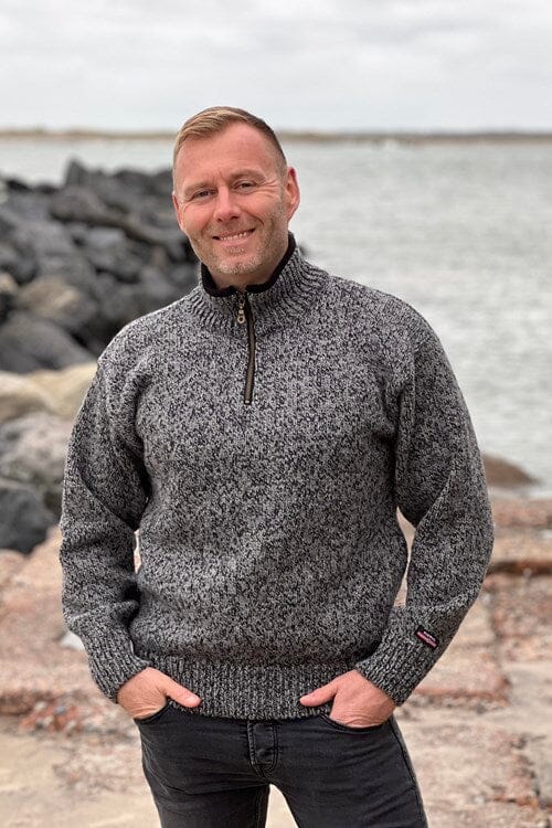 Kraftig Norsk sweater i flot twistgarns udgave af 100% ren ny uld fra NORWOOL of Norway. Her er tale om en lækker varm og blød strik i mélerede twistgarner af anthracitfarve og sort.