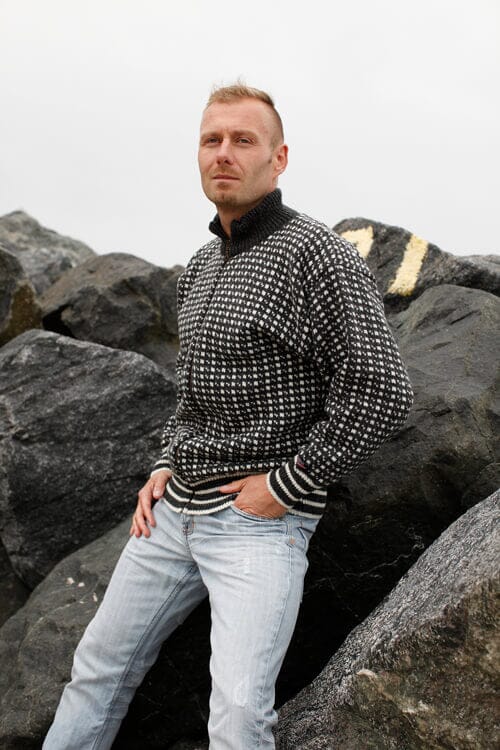 Flot klassisk cardigan med original Islænder mønster. Den er med gennemgående lynlås og høj hals, samt blødt sort fleece i halsen. Og produceret i Norge af 100% ren ny Norsk uld. Modellen er med fast høj rib kant & mønstret er et gammelt Islandsk strikke mønster. Det er en unisex udgave. Der passer til folk i alle aldre. Det er en lækker & blød uld kvalitet. Som er aldeles moderne retro mode i dag. Strikken er fra Norwool kollektionen & lavet af Norske Gjestal uld spinneri ASA. Som idag er et af de bedste og førende uld spinnerier i Norge.