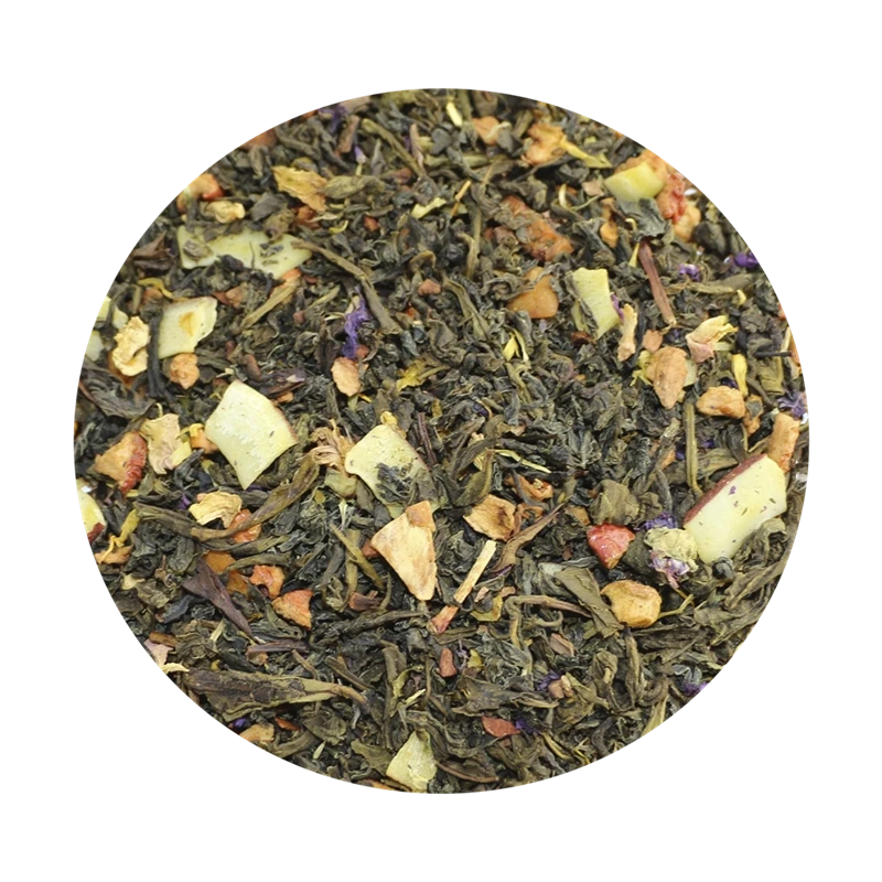 Grøn Ceylon te*(61%), æblestykker*(10%), mangostykker*(8%), kokosflager*, naturlig mango- mandarin og vaniljearoma(5%), morgenfrueblomster*, kornblomst* og/eller katostblomst*, rosenblade* *=økologisk
