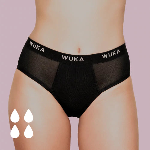 Det er det mellemste lag der absorberer blodet, hvor det yderste lag er fugttransporterende og holder dig sikker og tør hele dagen. Hvert eneste lag er åndbart, for at undgå og mindske lugt og infektion. Alle trusserne fra WUKA har en høj og bred kile for at holde blodet i trussen.