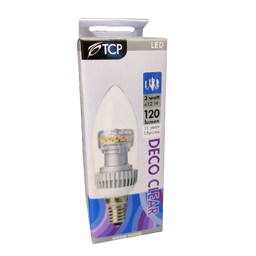 TCP - LED pære til højthængende lysekroner. Lys svarende til 12W pære, Dekorativt lys med klart glas. Ikke dæmpbar.