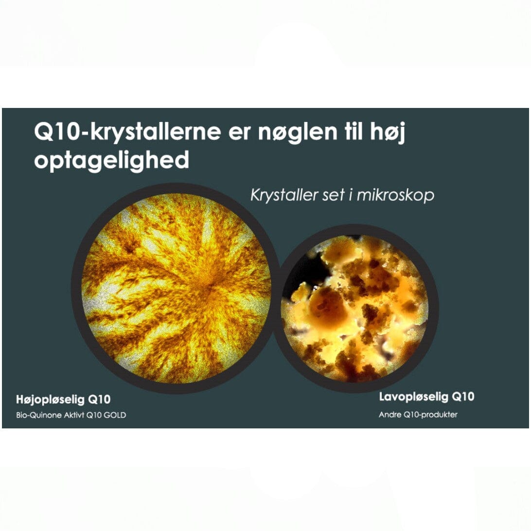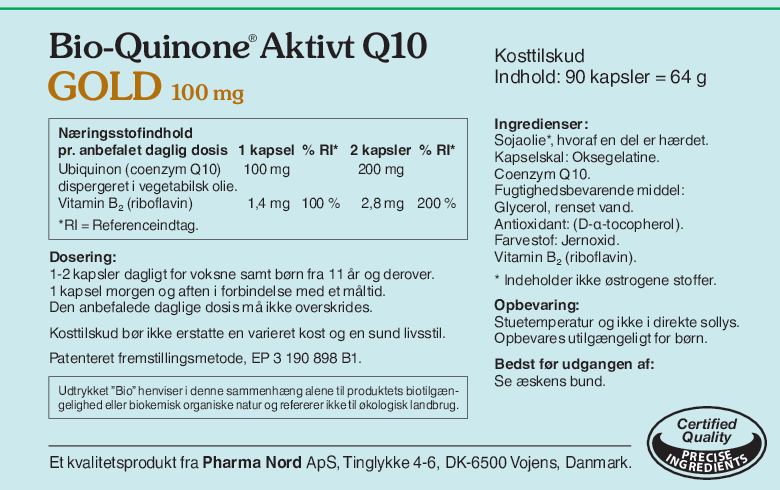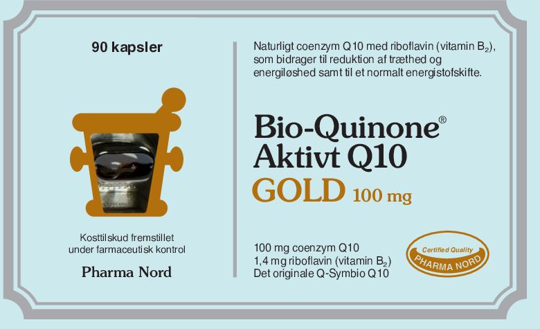 Q10-råvaren er et fedtopløseligt, krystallinsk stof, som kroppen har svært ved at optage, men ved hjælp af en særlig fremstillingsteknik udviklet og patenteret af Pharma Nord gennemgår Q10-råvaren en speciel varmebehandling, der medfører, at Q10-krystallerne opløses fuldstændig ved legemstemperatur. Det er denne komplette opløsning af Q10 og råvarens høje kvalitet samt fremstilling efter GMP-protokollen, der er årsag til, at man med Bio-Quinone Aktivt Q10 GOLD har opnået en så god optagelighed af aktivstoffet. Bio-Quinone Aktivt Q10 Gold med sit indhold af riboflavin bidrager til et normalt energistofskifte.