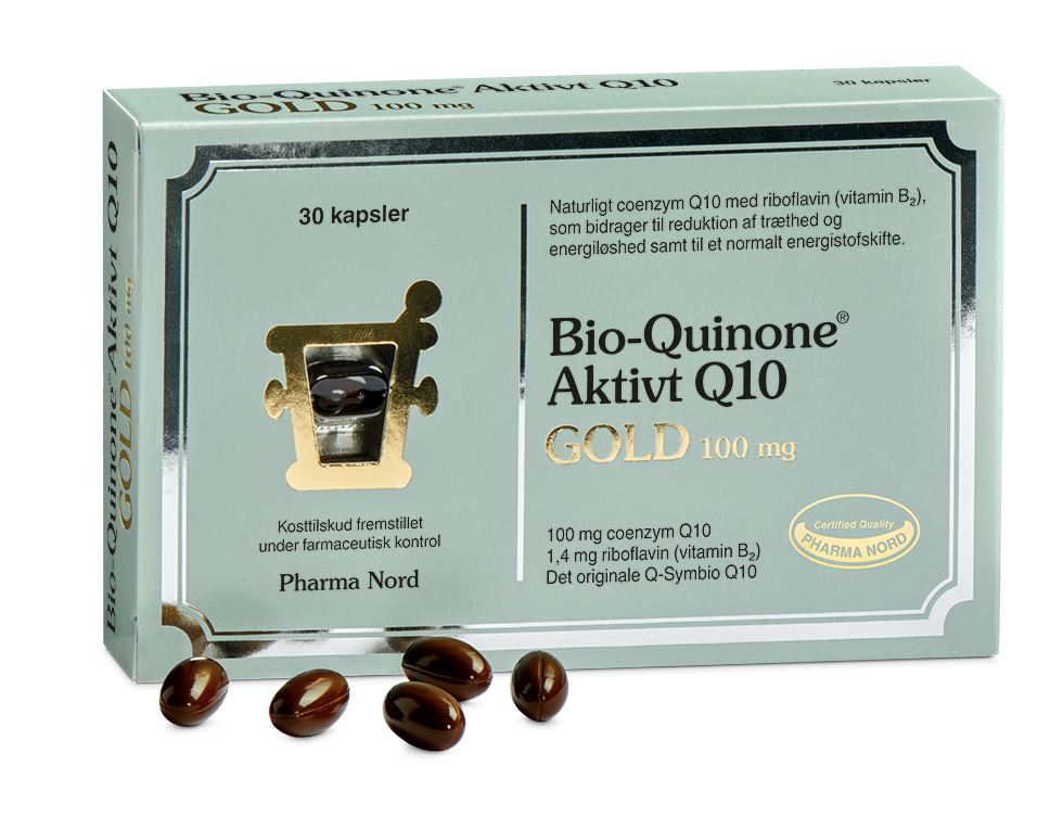 Bio-Quinone Aktivt Q10 GOLD består af bløde gelatinekapsler med Q10 i form af 100 mg aktivt ubiquinon opløst i vegetabilsk olie. Kapselskallen indeholder 1,4 mg riboflavin (vitamin B2) og kapslen er desuden lysforseglet. Præparatet har igennem flere årtier været verdens mest udbredte Q10-brand, hvilket hænger sammen med, at det er i stand til at dokumentere en høj optagelighed. Er dagdosis 2 kapsler fordeles de til hver sit måltid for bedste udnyttelse.