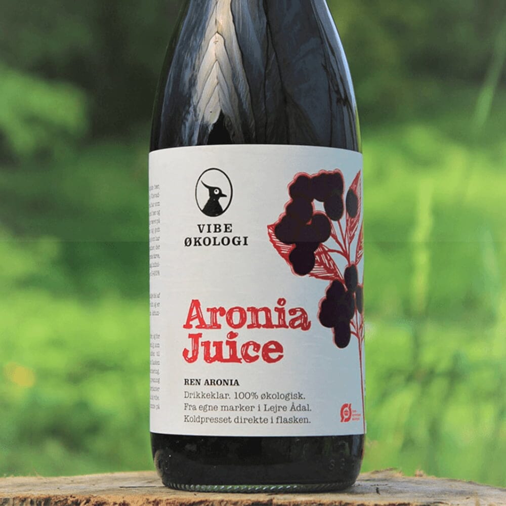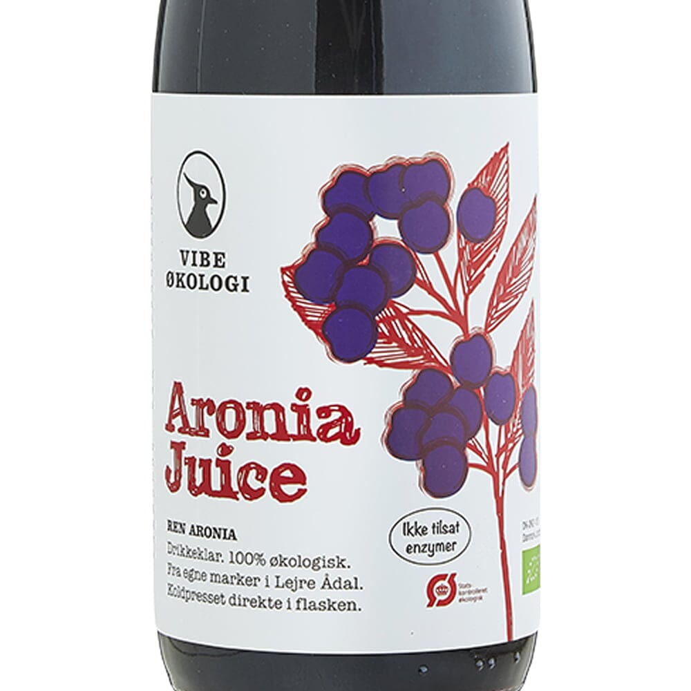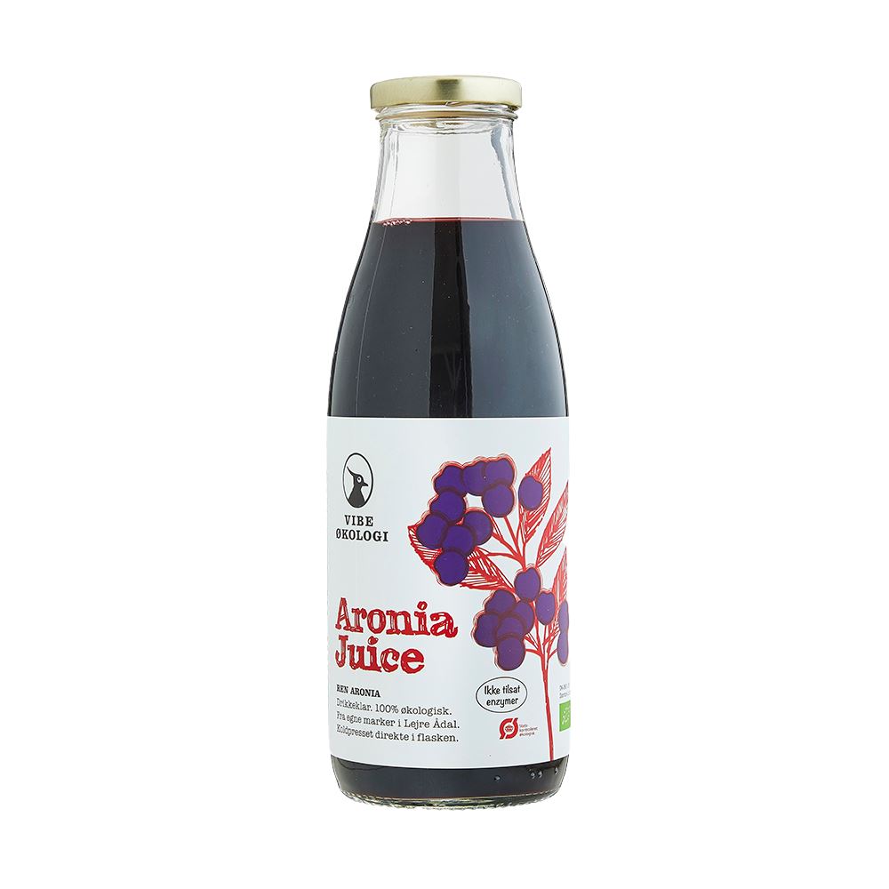 Ren Aronia Juice presset af økologiske bær dyrket på Vibevadgaard i Lejre Ådal. Juicen er tappet direkte i flasken og er pasteuriseret.