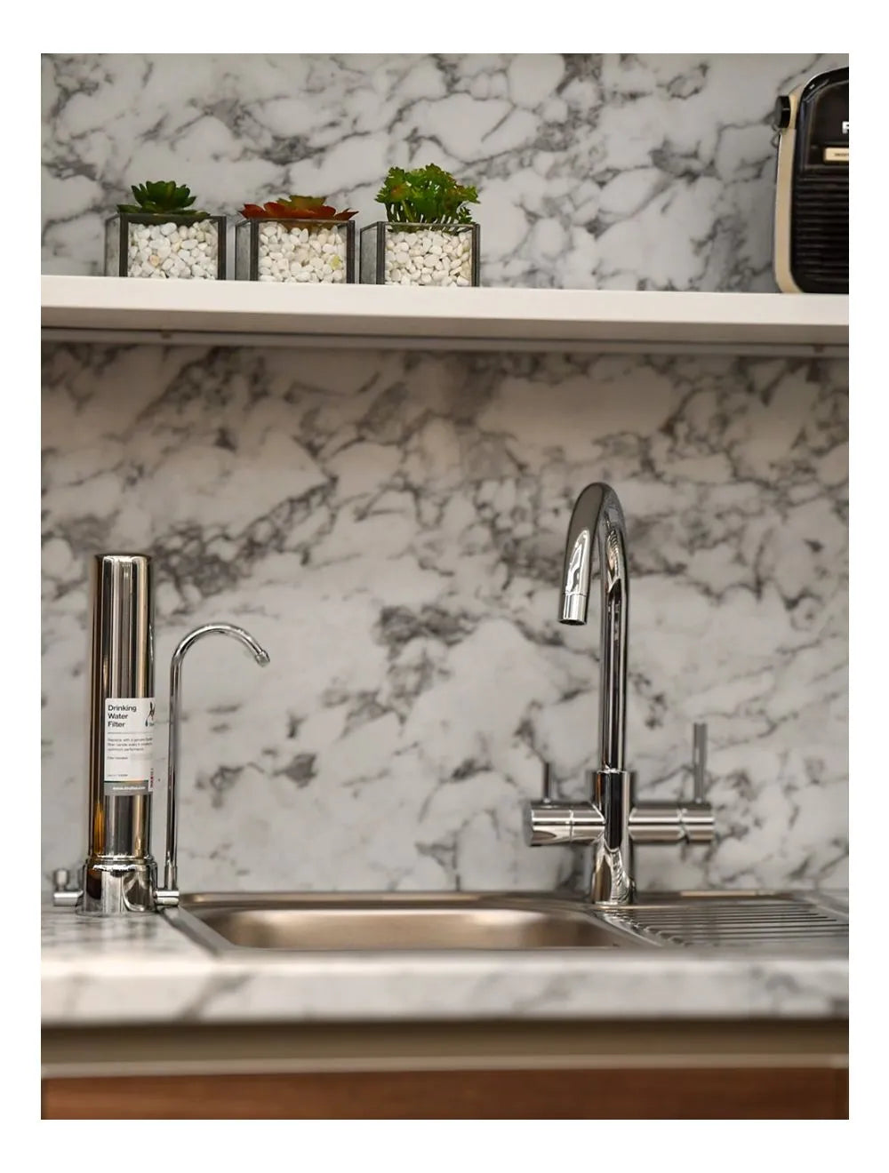 Anlægget kobles til en eksisterende vandhane og er designet til at stå ved siden af en vask på en køkkenbord. Det keramiske filter giver dig op til 300 liter i timen forfriskende rent drikkevand fra hanen.